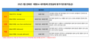 ◇ 2025년 2월 ‘대형 GA 내부통제 운영실태평가’ 강화금융당국은 24년 대형GA 내부통제 평가에 앞서 지난 2월 ‘대형 GA 내부통제 운영실태평가 기준’을 강화한 바 있다.