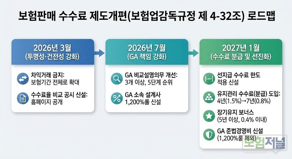 보험 판매 수수료 제도 개편이 다가오면서 GA 업계의 대응 시계가 빨라지고 있습니다. 2027년 1월부터 단계적으로 시행되지만, 업계는 중장기 로드맵보다는 당장 적용되는 과제부터 정비해야 한다는 목소리가 커지고 있는 상황입니다. 내년 3월에는 상품별 수수료 공시와 차익거래 금지 기간 연장이, 7월에는 비교설명 의무 강화 및 이른바 '1200%룰'의 GA 설계사 적용 등 주요 변화가 시행됩니다. 또한 2027년 1월부터는 유지관리수수료 도입과 함께 수수료 분급제 전환이 본격화될 예정입니다. 준비가 늦어질수록 리스크가 커질 수 있다는 우려 속에, 규제 환경 변화에 대한 신속하고 전략적인 대응이 필수적이라는 평가가 나옵니다.