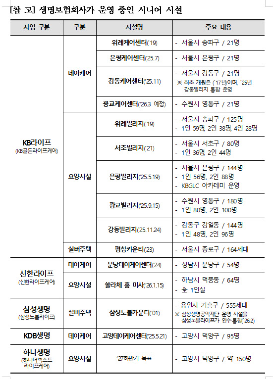 생보업계는 시설 공급과 함께 보험상품을 통한 돌봄 비용 부담 완화에도 주력하고 있다. 치매진단비, 장기요양·치매 재가급여 지원금, 입원간병인사용급여금, 중증치매 간병생활자금 등 치매·간병을 보험급부로 보장하는 상품을 판매 중이다. 사망보험금을 은퇴 후 매월 생활자금으로 받을 수 있는 역모기지형 종신보험도 출시해 사망 보장과 노후생활비를 동시에 대비할 수 있도록 했다.